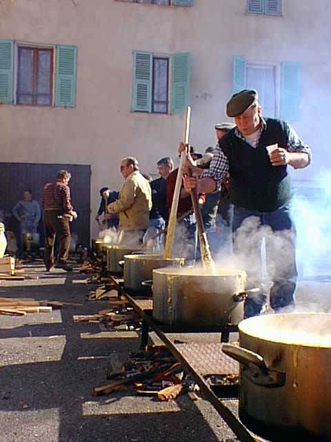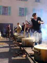 | Début MARS Toujours le mercredi des cendres. On fait "la nuit des Picouns" dans la nuit du lundi au mardi: le mardi c'est carnaval et le mercredi la polenta. La fête de la POLENTA est une des fêtes particulières, propres à Belvédère. Ce jour là, durant la période du carnaval, les hommes du village font la cuisine sur la place centrale. Fête interne au village au début, elle a pris de l'ampleur et attire de nombreux voisins, touristes. C'est l'occasion de revoir la famille, de se faire de nouveaux amis. C'est la fête de l'amitié par définition et la polenta est servie gratuitement de surcroît. |